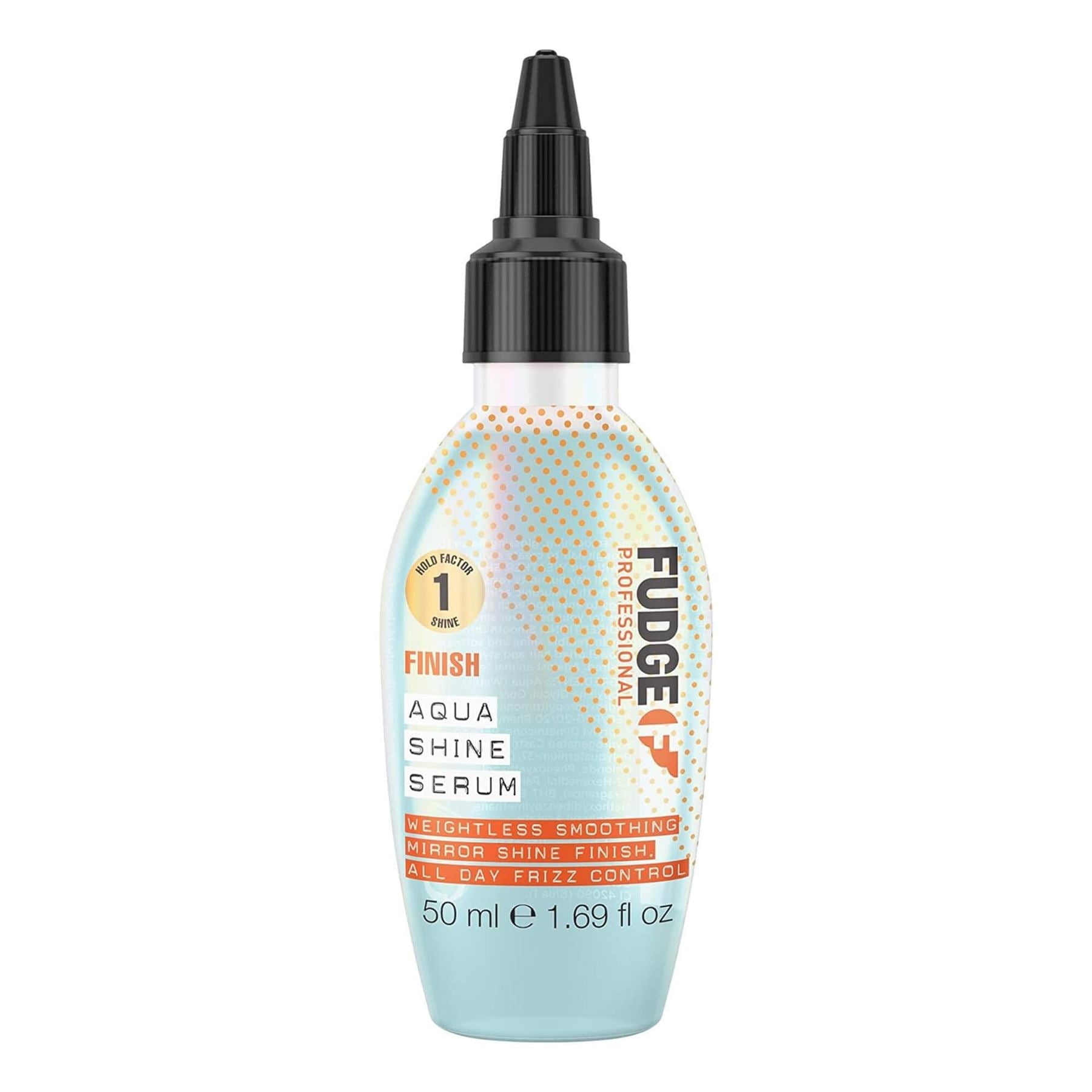 Fudge Aqua shine serum; our enhancing hair serum is the ultimate weightless, smoothing, glossing finish to every style. Smooth through hair to create a virtual umbrella of protection with our weather-shield technology that delivers all-day humidity resistance and frizz control. Infused with hyaluronic acid and our shine-lock technology to envelop each strand, Fudge Aqua shine enhancing hair serum smoothes down cuticles for your best ever smoothness and long-lasting shine.