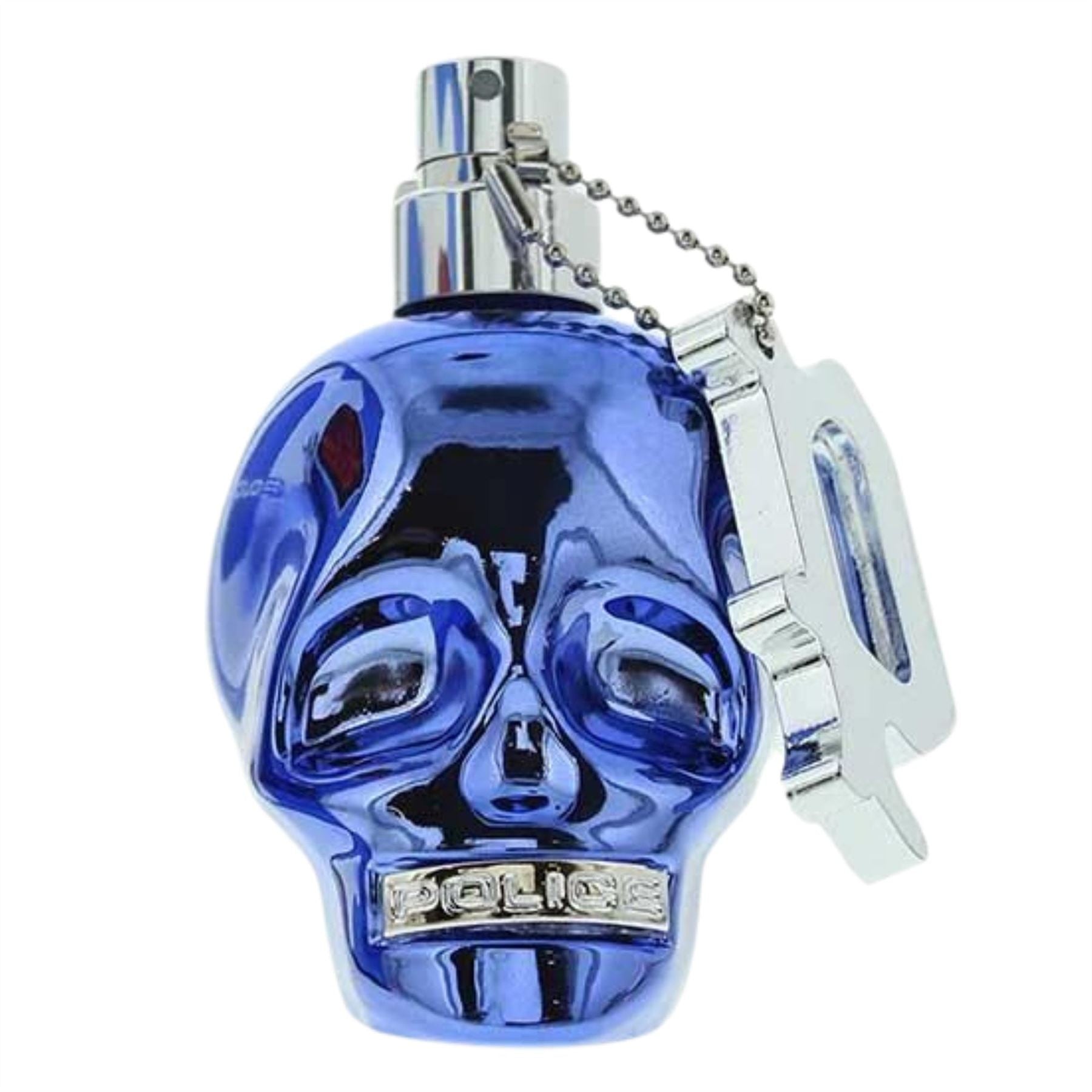 The bottle is designed in a luxurious metallic blue skull bottle.
