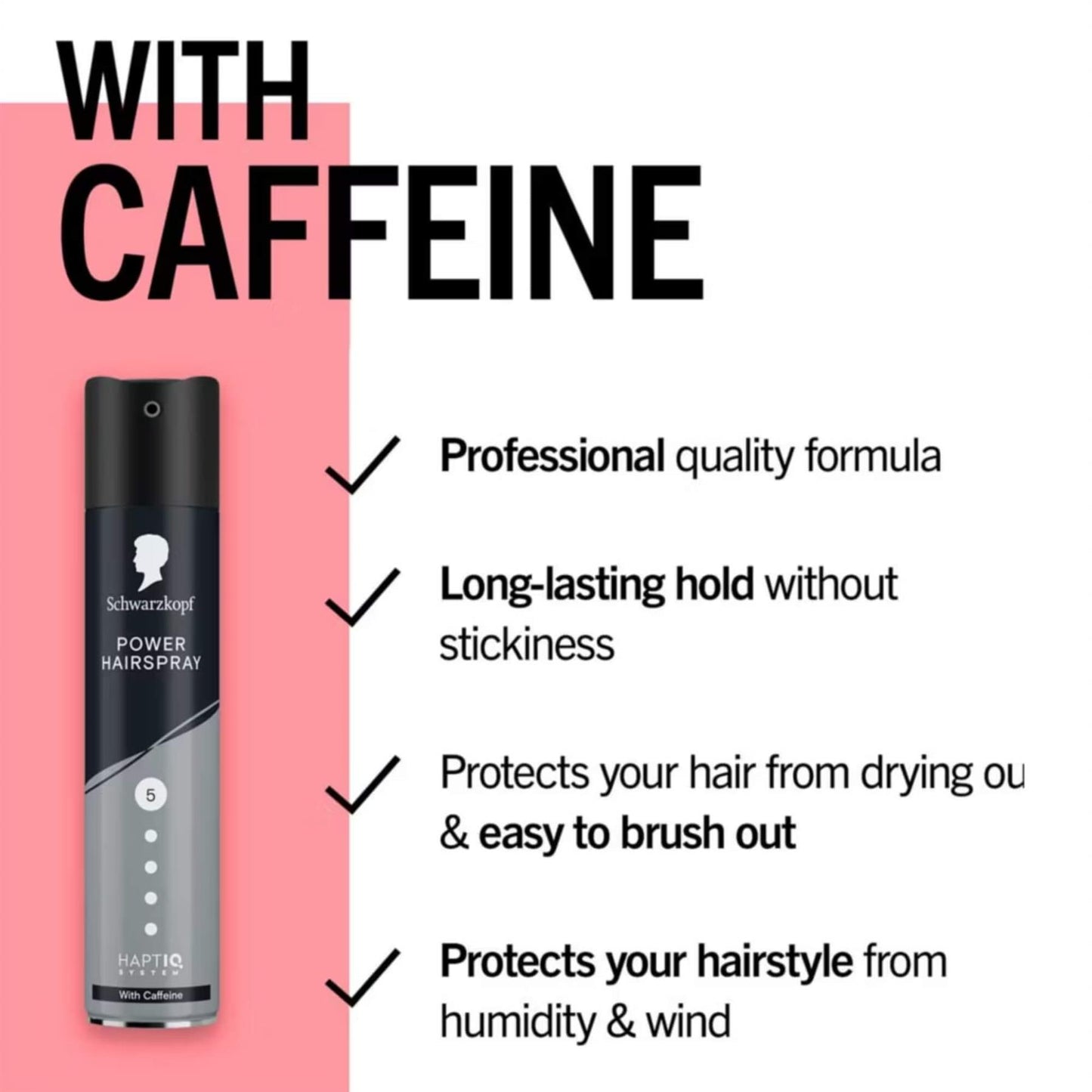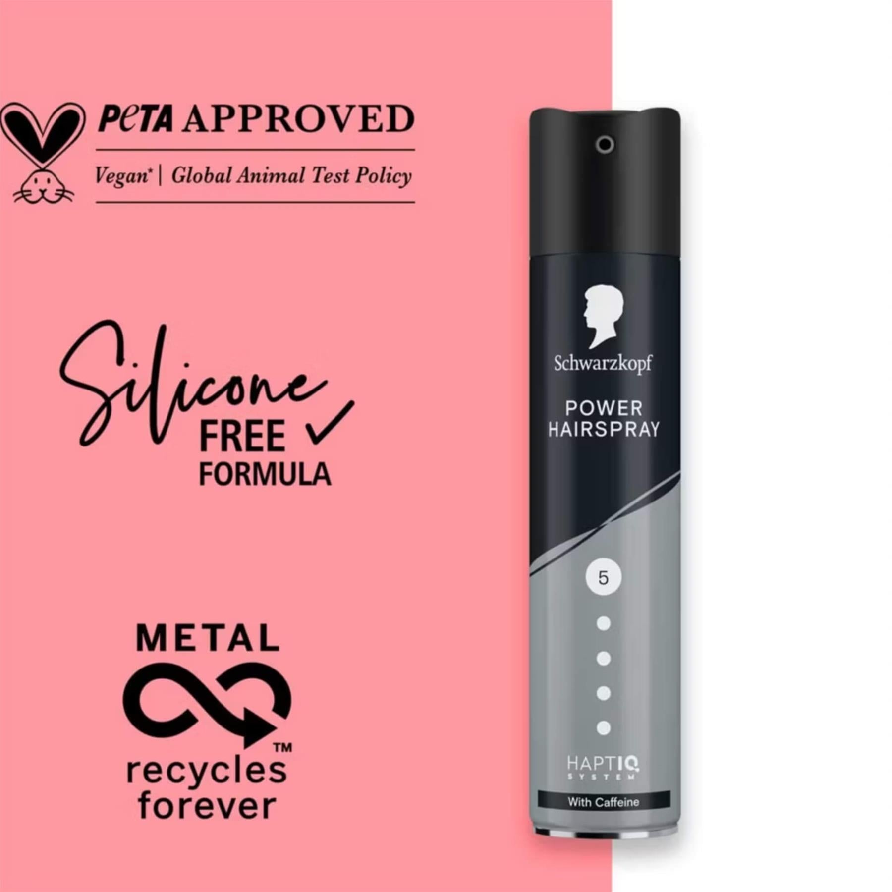 The innovative Schwarzkopf Power formula provides power hold and strengthens the hair from roots to tips. For long-lasting hold without stickiness, while being easy to brush out. Schwarzkopf hairspray helps to protect the hair from dry hair feeling, while giving you styling power hold even under weather conditions such as humidity and wind. The Schwarzkopf hair care spray features the HAPTIQ System to create micro bonds and strengthen the hair structure. For beautiful hairstyles you can see and feel. Schwarzkopf hairsprays use vegan formulas* and are silicone-free. How to apply: Spray from a distance of 30cm.
